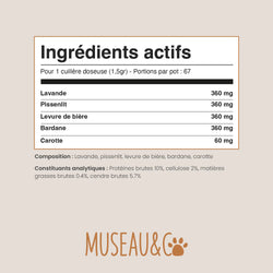 🍺 Levure de bière : naturellement riche en vitamines du groupe B, elle participe à la brillance du poil et à la résistance de la peau.