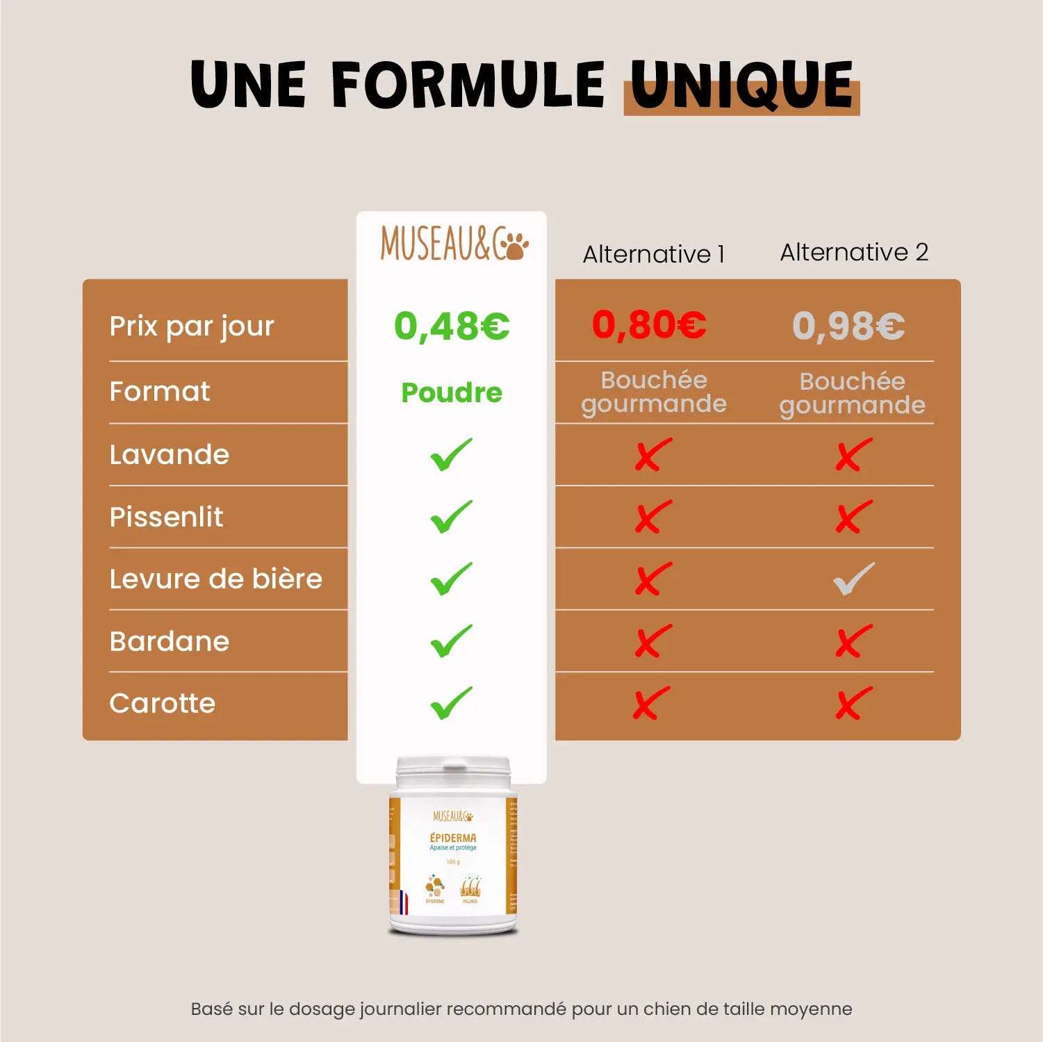 Épiderma est formulé avec des ingrédients naturels et sûrs, sans effets secondaires connus aux doses recommandées. En cas de pathologie spécifique ou de traitement médical en cours, demandez conseil à votre vétérinaire.