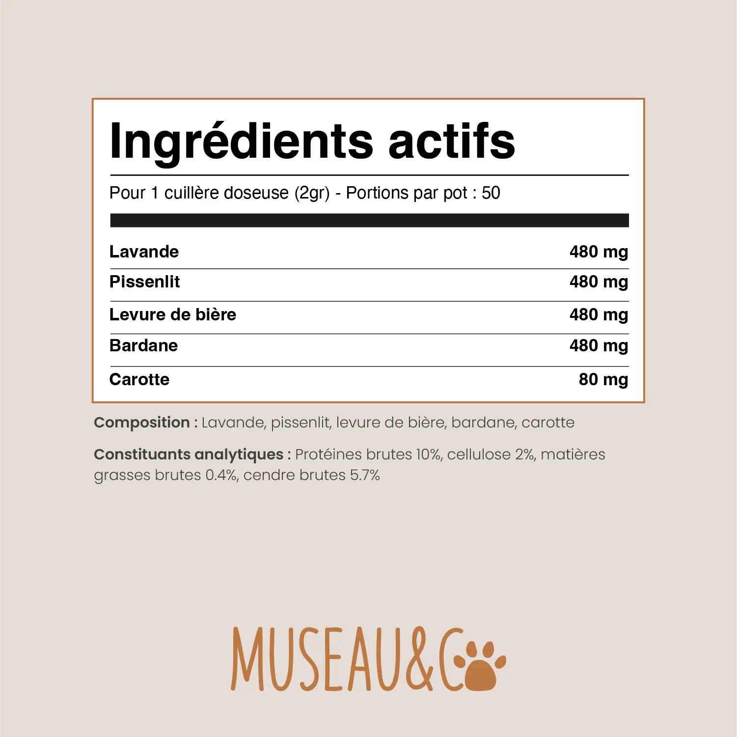 🌿Ingrédients pour 100 grammes : Lavande 24g, Pissenlit 24g, Levure de bière 24g, Bardane 24g, Carotte 4g