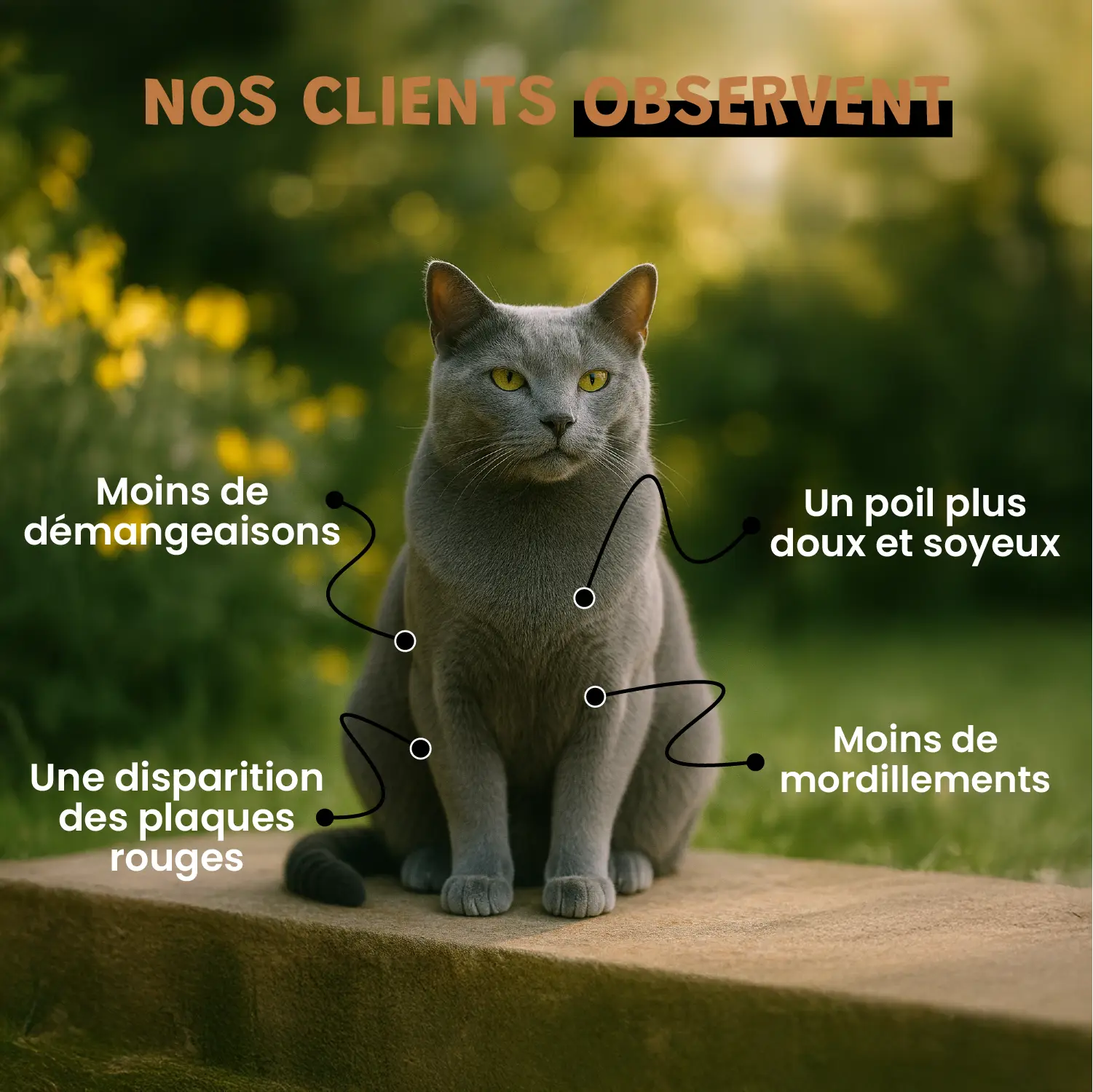 Les premiers effets peuvent apparaître après 3 à 4 semaines d’utilisation quotidienne : peau plus saine, poil plus brillant, démangeaisons réduites. Pour un effet durable, une cure prolongée est recommandée.