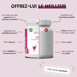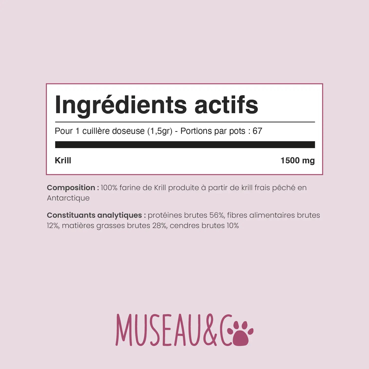 Krill Museau & Co favorise la souplesse articulaire, aide à maintenir un système immunitaire fort, soutient la fonction cardiaque et participe à un pelage brillant et sain.