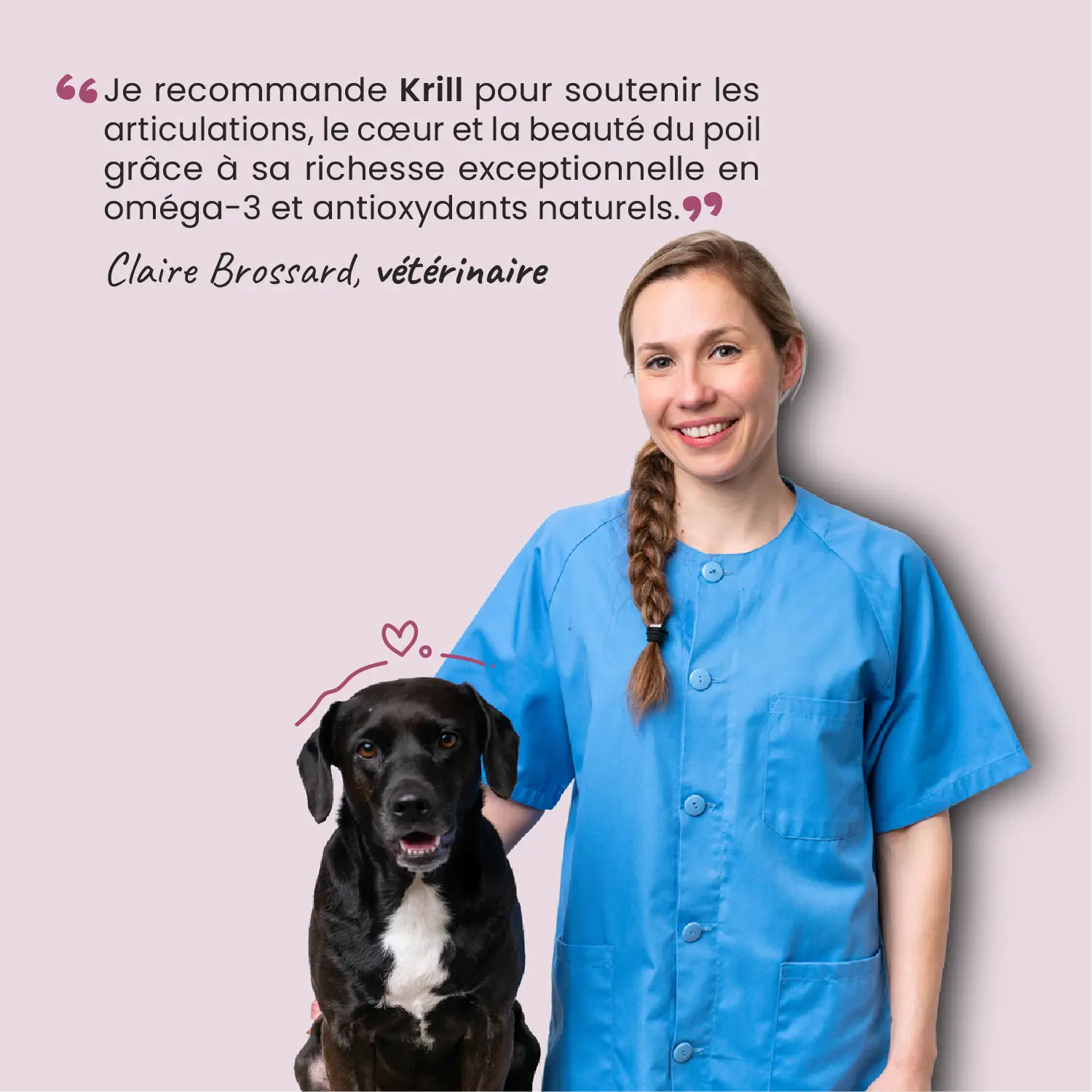 Le krill est riche en oméga-3 (EPA, DHA, ETA) ce qui aide à réduire l’inflammation, soulager la douleur et améliorer la mobilité des chiens souffrant d’arthrose ou de raideurs articulaires