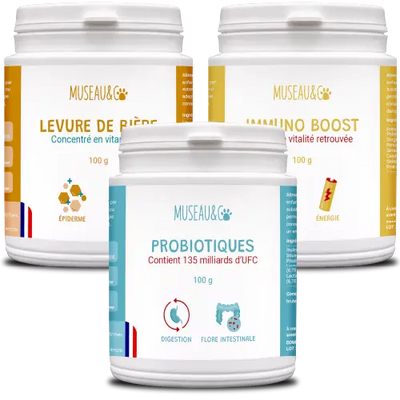 "Un trio intelligent pour soutenir la santé globale de votre animal. Immuno Boost renforce les défenses, les probiotiques rééquilibrent la flore intestinale et la levure de bière apporte nutriments essentiels. Cette synergie complète offre une approche naturelle du bien-être au quotidien."