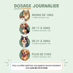 Suivez le tableau de posologie inscrit sur le pot et utilisez la cuillère doseuse incluse pour une dose parfaitement adaptée au gabarit de votre compagnon.