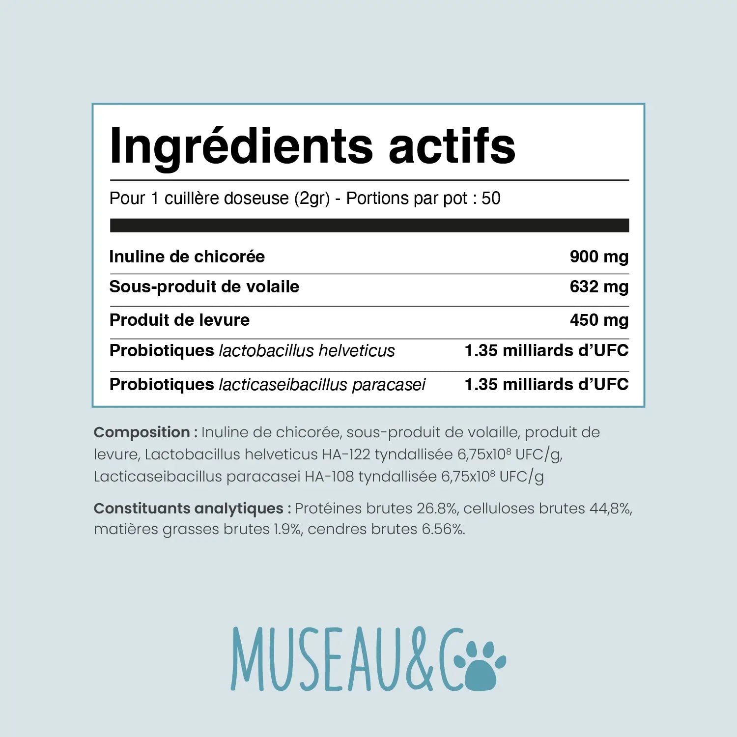 🌿Ingrédients pour 100 grammes : Inuline de chicorée 45g, Sous-produit de volaille 31.60g, Produit de levure 22.50g, Lactobacillus helveticus tyndallisée HA-122 (150 x 10⁹ UFC/g) 0.45g, Lacticaseibacillus paracasei tyndallisée HA-108 (150 x 10⁹ UFC/g) 0.45g