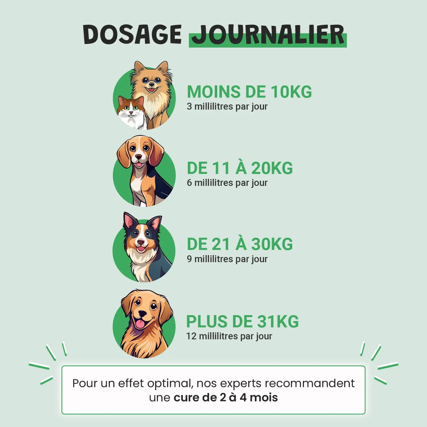 La durée dépend de la taille de votre animal : par exemple, pour un chien de 10kg, 3 ml par jour est nécessaire, un pot dure alors environ 2 mois.