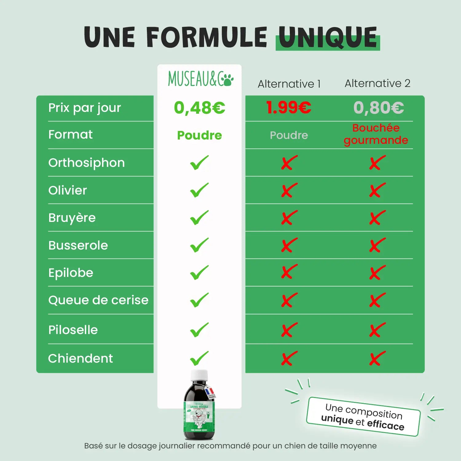 Je le recommande pour soutenir les chiens sujets aux inconforts urinaires ou aux besoins d’élimination accrus, afin de maintenir un appareil urinaire sain et bien équilibré."