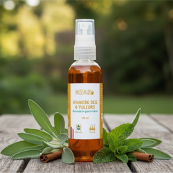 Le Vinaigre des 4 voleurs agit comme un soin purifiant naturel grâce à sa richesse en plantes aromatiques aux propriétés antibactériennes et tonifiantes.